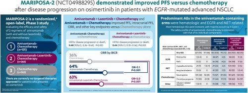 Mutations in the epidermal growth factor receptor (EGFR) gene are the most common actionable genomic alterations in non-small-cell lung cancer (NSCLC). Of EGFR mutations, 85%-90% are exon 19 deletions (Ex19del) and L858R substitution mutations.1,2 The current first-line standard of care in EGFR-mutated NSCLC is the third-generation EGFR tyrosine kinase inhibitor (TKI) osimertinib,3,4 which improved progression-free survival (PFS) and overall survival versus first-generation TKIs.5,6 Despite initial efficacy, nearly all patients treated with osimertinib develop resistance.7 Mechanisms of resistance to osimertinib are diverse and polyclonal, with the most common being alterations in the MET gene (e.g. up to 51% by fluorescence in situ hybridization)8 and EGFR pathways.9, 10, 11, 12 Guidelines recommend platinum-based chemotherapy as the next line of therapy,13,14 with a historical median PFS of 4.4-5.5 months in patients with disease progression after TKI treatment.15, 16, 17, 18Amivantamab, an EGFR-MET bispecific antibody with immune cell–directing activity,19, 20, 21 is approved for the treatment of patients with EGFR exon 20 insertion mutations whose disease progressed on or after platinum-based chemotherapy.22 Amivantamab has multiple mechanisms of action, including ligand blocking, receptor degradation, and engagement of effector cells (natural killer cells, monocytes, and macrophages) via its optimized Fc domain.19,20 Mechanistically, by binding extracellularly, amivantamab bypasses intracellular mutations (including those at the TKI catalytic domain), and its bispecific nature addresses MET as a mechanism of resistance. Clinically, amivantamab has shown activity against a wide range of activating and resistance mutations in EGFR-mutated NSCLC and in patients with MET exon 14 skip mutations.23, 24, 25, 26Lazertinib is a highly selective, central nervous system (CNS)–penetrant, third-generation TKI with demonstrated efficacy in activating EGFR mutations and T790M resistance.27,28 Simultaneously targeting the extracellular and catalytic EGFR domains by combining amivantamab with lazertinib (amivantamab–lazertinib) has been shown to provide a synergistic benefit.29,30 Amivantamab–lazertinib has demonstrated clinically meaningful activity in patients with EGFR-mutated NSCLC after disease progression on osimertinib.31 Additionally, continuation of a CNS-penetrant, third-generation TKI, such as lazertinib, after disease progression on osimertinib has been thought to be important since brain metastasis is a frequent outcome for patients with EGFR-mutated NSCLC.32The addition of carboplatin–pemetrexed (chemotherapy) to amivantamab or amivantamab plus lazertinib could address osimertinib-based resistance. In a phase I study, amivantamab–chemotherapy demonstrated an objective response rate of 44% in a safety population of 20 patients with advanced and refractory NSCLC.33 In a separate phase I study, amivantamab–lazertinib–chemotherapy was evaluated in 20 patients with EGFR-mutated NSCLC whose disease had progressed on prior TKIs and showed an objective response rate of 50%.34 The aforementioned results supported further evaluation.MARIPOSA-2 is a global, randomized, phase III trial assessing the efficacy and safety of amivantamab–chemotherapy and amivantamab–lazertinib–chemotherapy versus chemotherapy in patients with EGFR-mutated advanced NSCLC whose disease had progressed on or after osimertinib monotherapy.