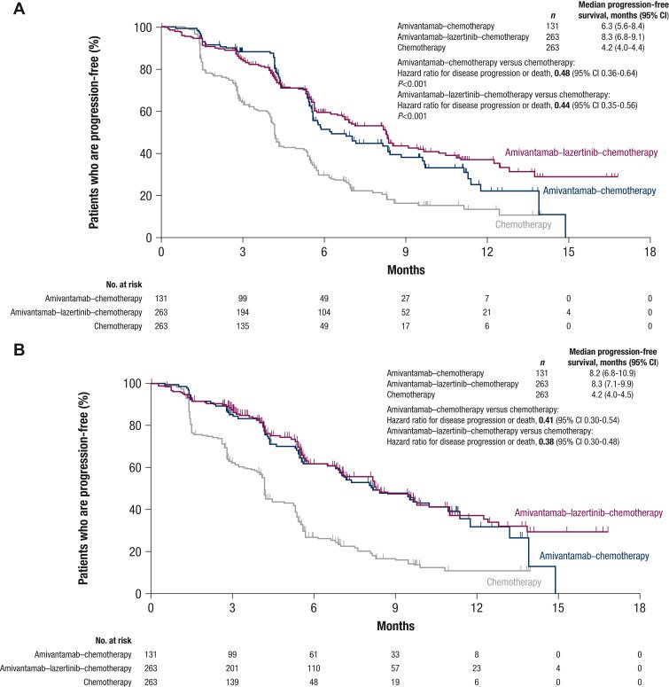 The median investigator-assessed PFS was 8.2 months (95% CI 6.8-10.9 months) for amivantamab–chemotherapy and 8.3 months (95% CI 7.1-9.9 months) for amivantamab–lazertinib–chemotherapy versus 4.2 months (95% CI 4.0-4.5 months) for chemotherapy, corresponding to HRs for disease progression or death of 0.41 (95% CI 0.30-0.54) and 0.38 (95% CI 0.30-0.48), respectively (Figure 1B and Supplementary Figure S4 and Table S2, available at https://doi.org/10.1016/j.annonc.2023.10.117).