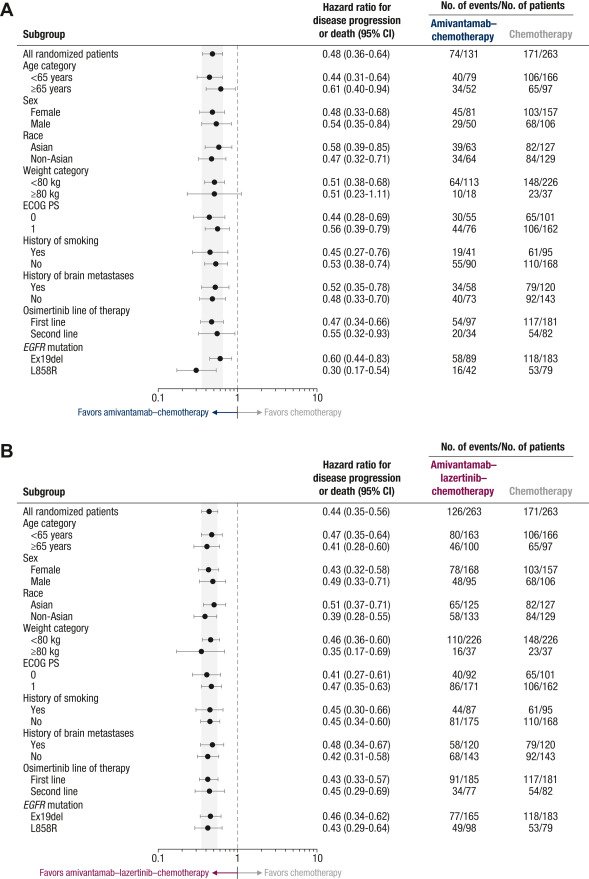 Shown are forest plots of progression-free survival in patient subgroups assessed by blinded independent central review for amivantamab–chemotherapy versus chemotherapy (A) and for amivantamab–lazertinib–chemotherapy versus chemotherapy (B). The efficacy analysis set included all randomized patients. The shaded areas indicate the 95% CI for the overall hazard ratio (all patients). CI, confidence interval; ECOG PS, Eastern Cooperative Oncology Group performance status.