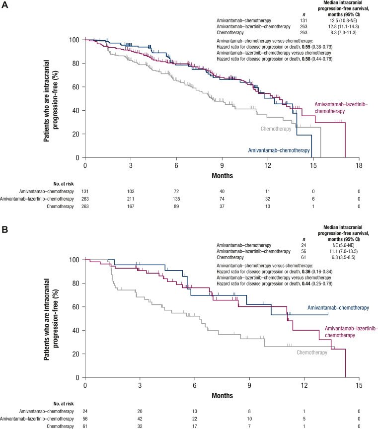 All baseline characteristics were well balanced across the three arms, including by history of brain metastases and prior brain radiation. PFS was significantly longer for amivantamab–chemotherapy and amivantamab–lazertinib–chemotherapy versus chemotherapy [hazard ratio (HR) for disease progression or death 0.48 and 0.44, respectively; P < 0.001 for both; median of 6.3 and 8.3 versus 4.2 months, respectively]. Consistent PFS results were seen by investigator assessment (HR for disease progression or death 0.41 and 0.38 for amivantamab–chemotherapy and amivantamab–lazertinib–chemotherapy, respectively; P < 0.001 for both; median of 8.2 and 8.3 versus 4.2 months, respectively). Objective response rate was significantly higher for amivantamab–chemotherapy and amivantamab–lazertinib–chemotherapy versus chemotherapy (64% and 63% versus 36%, respectively; P < 0.001 for both). Median intracranial PFS was 12.5 and 12.8 versus 8.3 months for amivantamab–chemotherapy and amivantamab–lazertinib–chemotherapy versus chemotherapy (HR for intracranial disease progression or death 0.55 and 0.58, respectively). Predominant adverse events (AEs) in the amivantamab-containing regimens were hematologic, EGFR-, and MET-related toxicities. Amivantamab–chemotherapy had lower rates of hematologic AEs than amivantamab–lazertinib–chemotherapy.