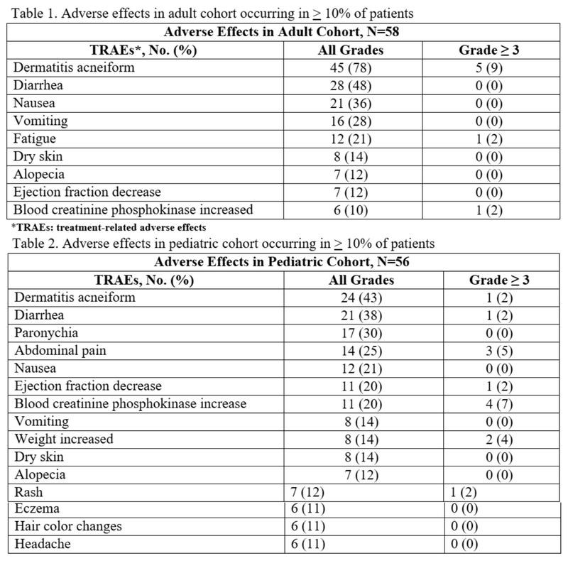 - Included 58 adults and 56 pediatric patients with NF1-PN causing significant morbidity. Adults and pediatrics were enrolled in separate cohorts.