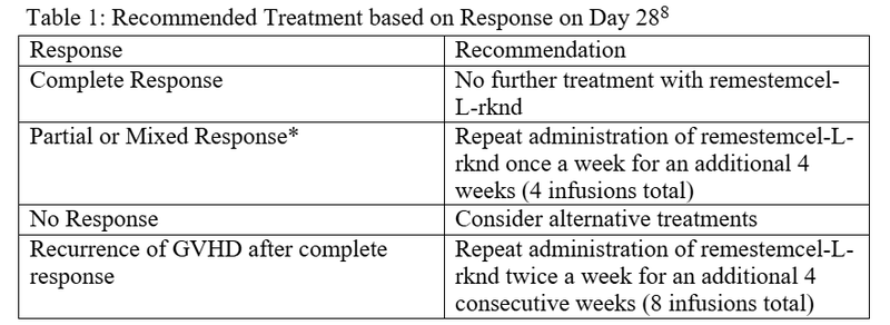 - When studied under the original brand name of Prochymal®, as compared to placebo in the US study, remestemcel-L-rknd failed to meet its primary endpoint of durable complete response of steroid-refractory aGVHD (SR-aGVHD) lasting 28 days.